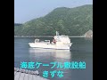 長崎港を拠点とする海底ケーブル敷設船きずな。二基のクレーンを...