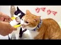 茶トラ猫「マック」の誕生日の8月7日の夜、ちゅ〜るパーティー...